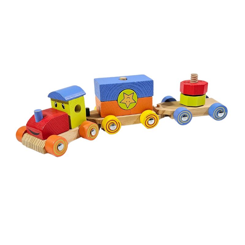lokomotiva in dva vagona s pisanimi kockami.