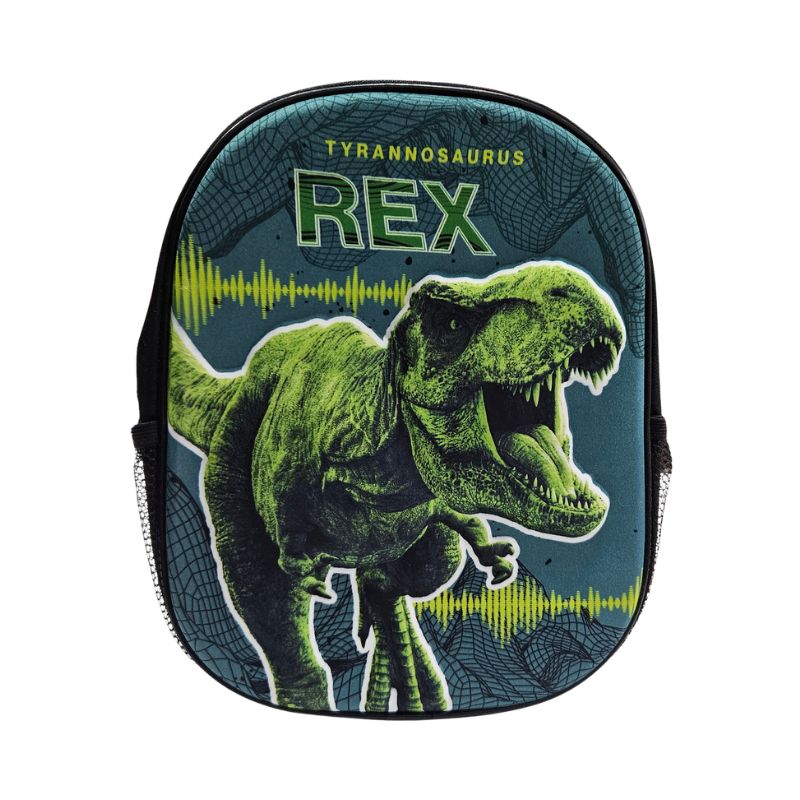 Manjši nahrbtnik z motivom dinozavra in mrežastim žepom ob strani.