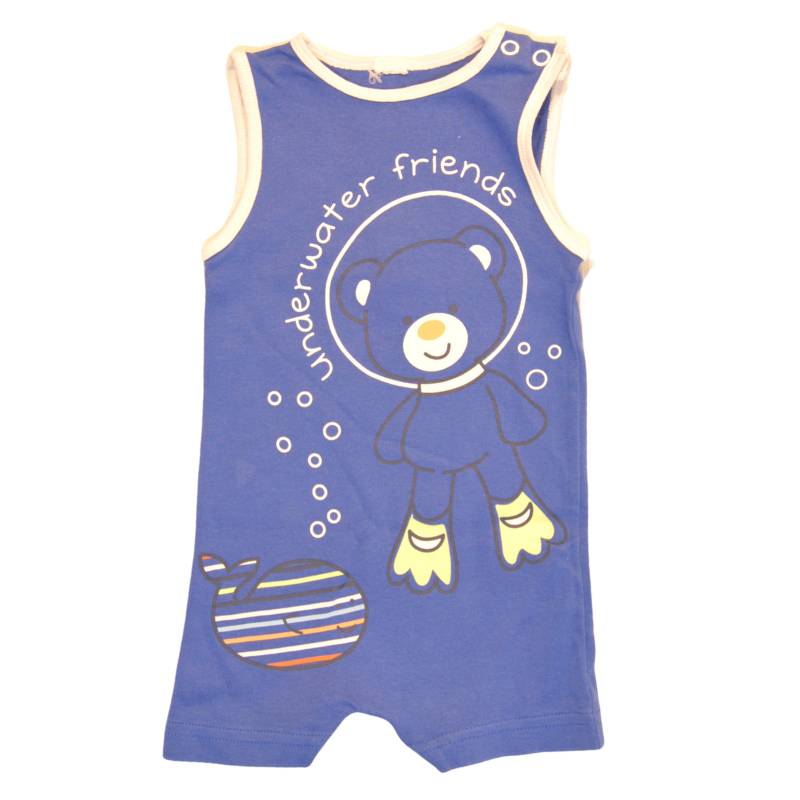 Pajac št. 56 z naramnicami, v temno modri barvi, z medvedom in kitom.